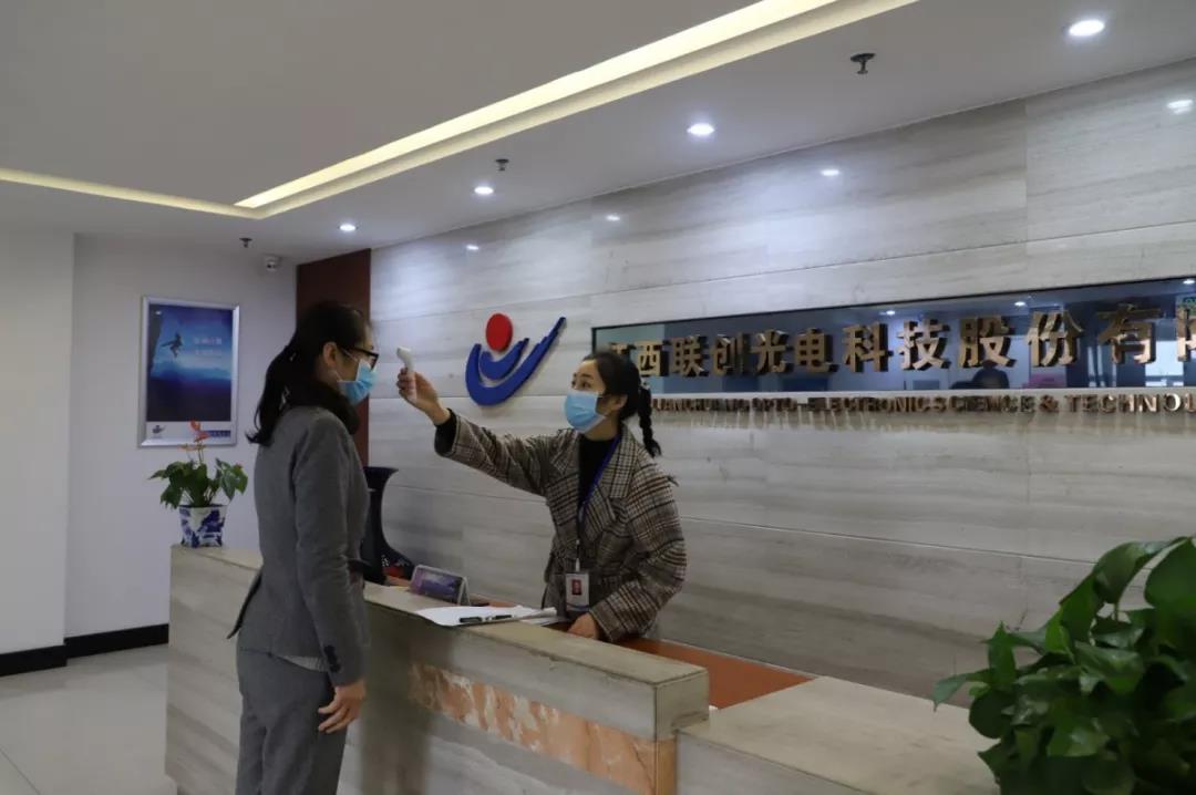 聯(lián)創(chuàng)光電科技園區(qū)實施封閉式管理,人員及車輛需憑核發(fā)的出入證進(jìn)出園區(qū)。園區(qū)東門崗和南門崗分別設(shè)立體溫檢測點,對所有人員進(jìn)行實名制身份證查驗、體溫測量和信息登記,堅決杜絕體溫異常人員進(jìn)入園區(qū)和生產(chǎn)、公共辦公場所。
