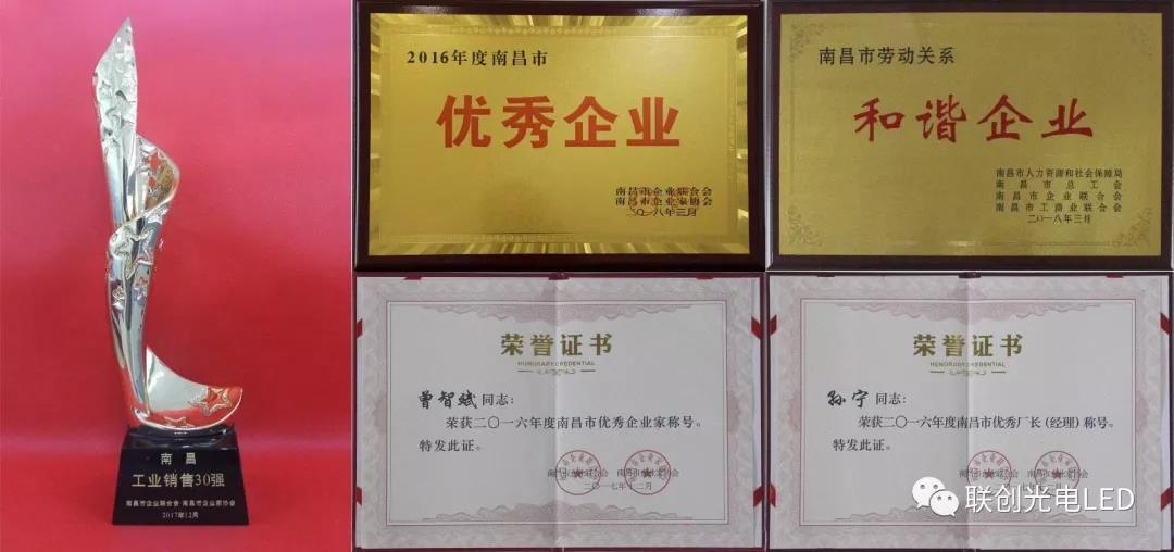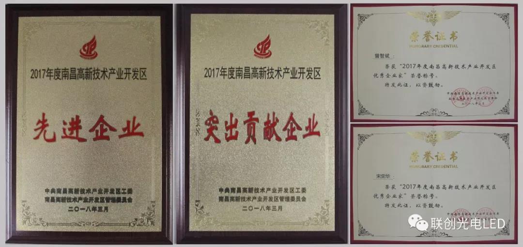 南昌高新區(qū)召開(kāi)2018年經(jīng)濟(jì)工作暨科技創(chuàng)新大會(huì),聯(lián)創(chuàng)光電被授予“2017年度南昌高新區(qū)先進(jìn)企業(yè)”、“2017年度南昌高新區(qū)突出貢獻(xiàn)企業(yè)”榮譽(yù)稱(chēng)號(hào),股份公司董事長(zhǎng)曾智斌、總裁助理宋榮華分別榮獲“2017年度南昌高新區(qū)優(yōu)秀企業(yè)家”稱(chēng)號(hào)。