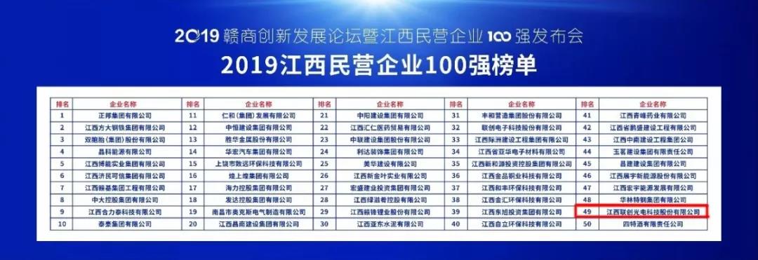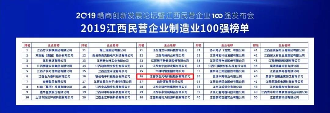 會(huì)上發(fā)布了2019江西民營(yíng)企業(yè)100強(qiáng)、2019江西民營(yíng)企業(yè)制造業(yè)100強(qiáng)名單,聯(lián)創(chuàng)光電均上榜,分別位列江西民營(yíng)企業(yè)100強(qiáng)第49位、江西民營(yíng)企業(yè)制造業(yè)100強(qiáng)第26位。聯(lián)創(chuàng)光電常務(wù)副總裁葉建青代表公司參會(huì)并領(lǐng)取獎(jiǎng)牌。
