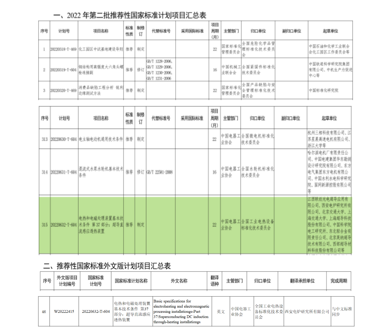 近日,國家標(biāo)準(zhǔn)化管理委員會(huì)(以下簡稱“國標(biāo)委”)發(fā)文下達(dá)2022年第二批推薦性國家標(biāo)準(zhǔn)計(jì)劃及相關(guān)標(biāo)準(zhǔn)外文版計(jì)劃,我集團(tuán)旗下子公司-江西聯(lián)創(chuàng)光電超導(dǎo)應(yīng)用有限公司(以下簡稱“聯(lián)創(chuàng)超導(dǎo)”)作為目前全球首家兆瓦級超導(dǎo)感應(yīng)加熱裝置的生產(chǎn)單位,牽頭申報(bào)的《超導(dǎo)直流感應(yīng)透熱裝置》推薦性國家技術(shù)標(biāo)準(zhǔn),獲批立項(xiàng),正式進(jìn)入標(biāo)準(zhǔn)草案起草階段,其作為全球領(lǐng)先的技術(shù),將同步翻譯英文版標(biāo)準(zhǔn)。
